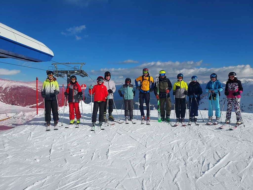 Heute war der 4. Skitag. Wir haben wie üblich den Tag mit einem leckeren Frühstück gestartet. Nachdem wir uns alle satt gegessen haben, haben wir uns ca. 8:30 Uhr auf dem Weg zu unseren Skiern gemacht. Im Anschluss daran sind wir mit der ganzen Gruppe zur Gondel gelaufen. Nach einer kleinen Aufwärmung und etwas Einfahren, haben wir eine Slalom Piste auf Zeit absolviert, alle wahren so ziemlich mit ihren Ergebnissen zufrieden. Wir waren ziemlich schnell fertig und hatte noch etwas Zeit, um einfach ein bisschen rumzufahren. Langsam war es Zeit für das Mittagessen und nach und nach kamen alle an dem Restaurant an. Jeder hat sich das bestellt worauf er Appetit hatte und sich satt gegessen. 13:30 Uhr waren wir auf dem Weg zum Gitschberg, dort durften wir eine (für Anfänger 😅) relativ schwere Piste fahren (🛑 Piste). Anschließend bereiteten wir uns auf eine Leistungskontrolle vor, die alle Sachen beinhaltet die wir die letzten Tage geübt haben. Es lief alles super und wir sind zum Schluss noch mal eine lange Piste runtergefahren. 15:30 waren wir ungefähr fertig. (Text: Dora)