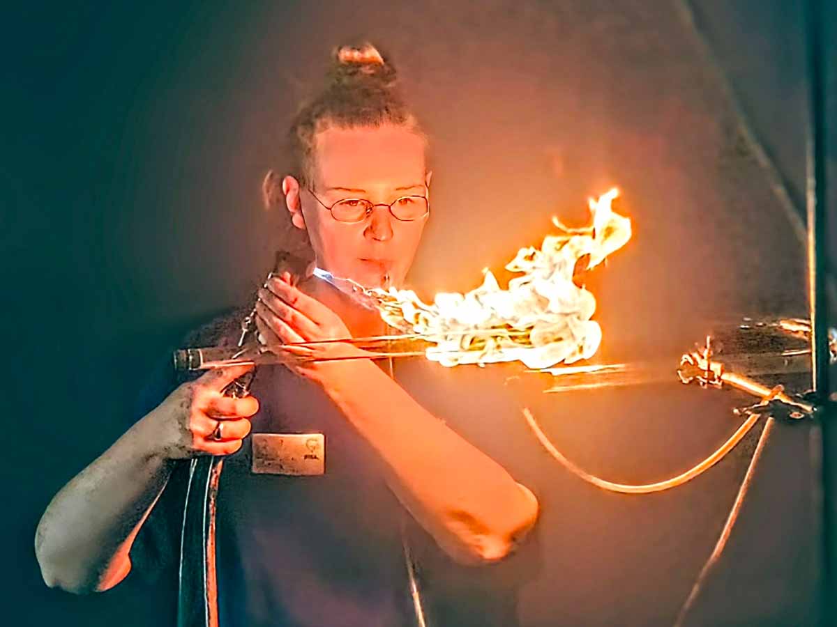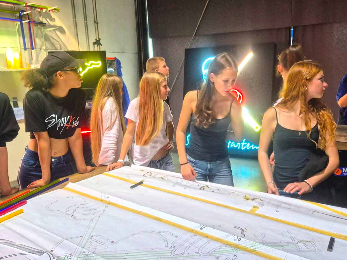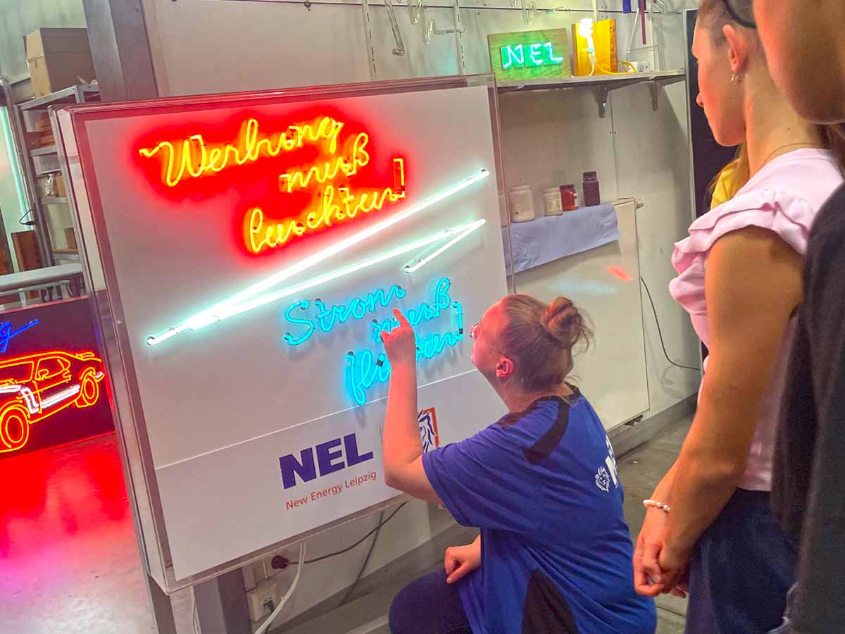 Während der Führung durch die einzelnen Abteilungen stellten wir fest, dass NEL über die ganze Stadt hinweg, Dinge zum Leuchten bringt, so z.B. das riesige Sparkassen-S, die Beleuchtung auf dem Uni-Riesen, im Hauptbahnhof, die Löffelfamilie in der Südvorstadt und noch vieles mehr. Hergestellt wird das alles in den eigenen Werkstätten, u.a. mit 3-D-Druckverfahren, aber auch in der hauseigenen Glasbläserei. Frau Lehmann, selbst Glasbläsermeisterin, zeigte uns auf beeindruckende Weise, wie aus einfachen Glasröhren leuchtende Bilder und Schrift entstehen.