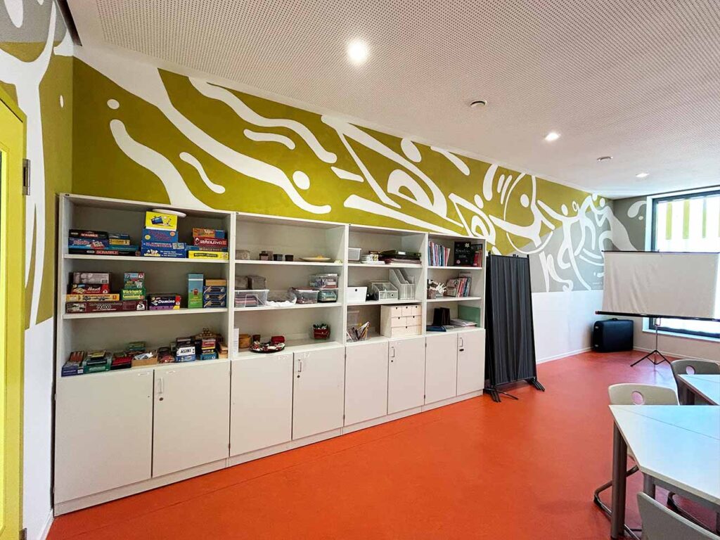 Gemeinsam mit Herrn Gottas (Vater und Rechtsanwalt) und dem freiberuflichen Künstler Herrn Lose wurde die Freizeitoase neu gestaltet und funktional weiterentwickelt. Das Ergebnis kann sich sehen lassen: Der Raum steht nun vielseitig zur Verfügung – sei es für unser Physio-Angebot, als Besprechungsraum oder für kleinere Gruppenarbeiten.