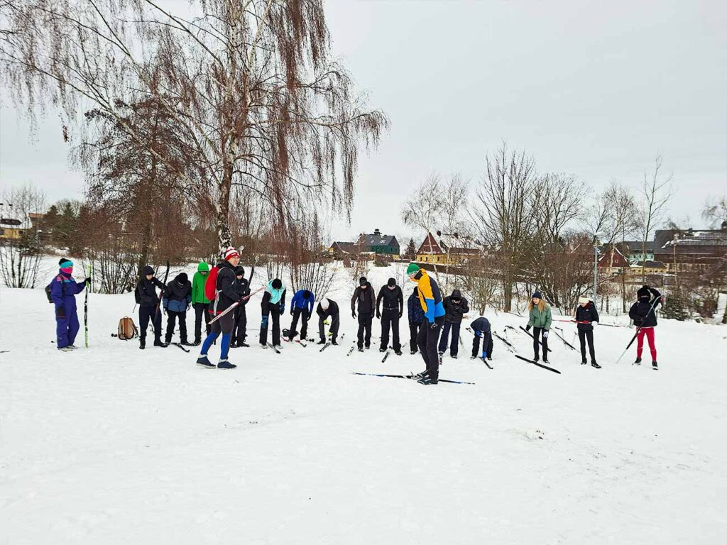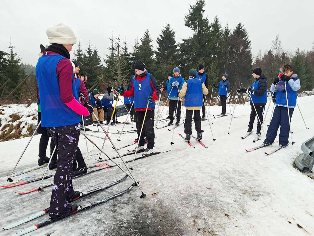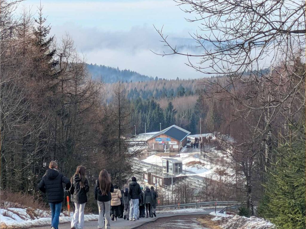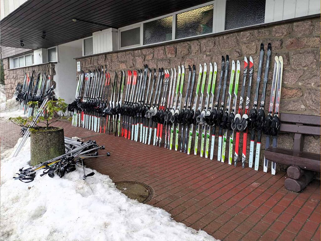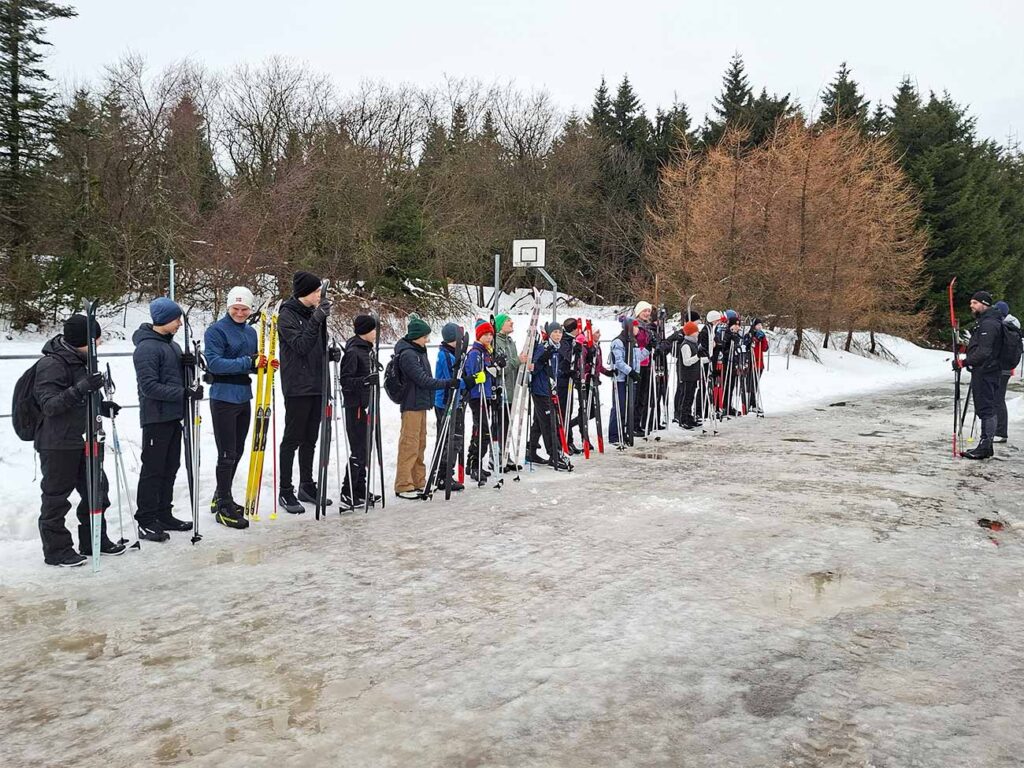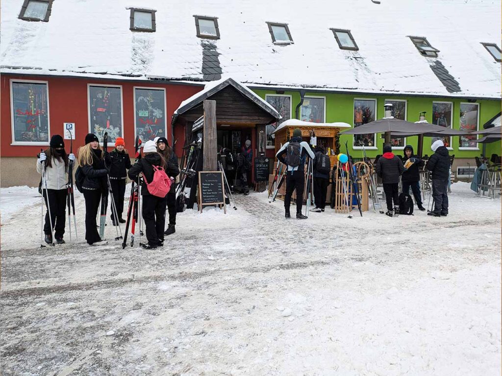 Nach einem kurzen Zwischenstopp im Hotel Lugsteinhof zum Entgegennehmen der Zimmerschlüssel und Abstellen der Koffer ging es direkt weiter zur Skiausleihe in Altenberg. Dort erhielten alle Schülerinnen und Schüler klassenweise ihren geliehenen Ski inklusive Schuhe und Stöcke und konnten dank des herrlichen Winterwetters gleich ihre erste Langlauf-Trainingseinheit absolvieren. Jede Klasse wurde dabei von zwei Sportlehrerinnen bzw. Sportlehrern betreut; diese Teams blieben über die gesamte Winterlagerwoche hinweg bestehen.